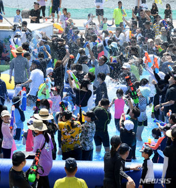 【NEWSIS】猛暑が連日続いている30日、全羅南道長興郡の耽津江近くで正南津長興水祭りが行われた。写真はメインステージのプールで水鉄砲をする人々。