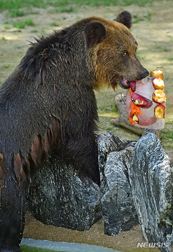 【NEWSIS】猛暑警報が出された27日午後、大邱市中区の達成公園では、ヒグマが果物と野菜でできた氷のおやつを食べながら暑さをしのいでいる。