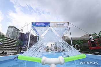 【NEWSIS】2023年ソウル・サマー・ビーチの開幕を明日に控えた27日、ソウル中心部の光化門広場では、プールの設置など大詰めの作業が行われていた。