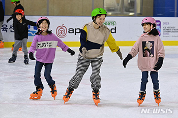 韓国各地に猛暑警報が発令された27日、京畿道水原市の光教複合体育センターのアイスリンクでは、市民がスケートをして暑さを紛らわせていた。
