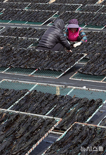 【NEWSIS】春らしい日差しが注ぐ天気となった17日、釜山市機張郡のある漁村で、乾燥台に広げて乾しておいた「機張ワカメ」を見てまわる漁業者たちの様子。機張ワカメは釜山市機張郡を代表する特産物で、よそ..