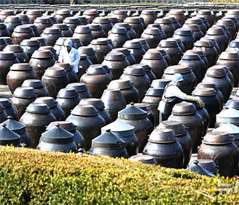 【NEWSIS】二十四節季の一つ「春分」まであと三日と迫った17日、京畿道安城市一竹面の「ソイル農園」のジャンドク台(甕置き台)では、従業員が壺に積もった埃を払っていた。