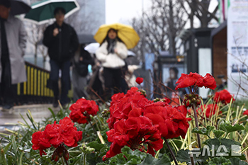 【NEWSIS】韓国各地で春の雨となった18日午前、ソウル市庁近くで、傘をさして歩く人々。