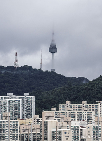 【NEWSIS】ソウル全域に豪雨注意報が発令された23日午後、ソウル市中区のNソウルタワーは雲に包まれていた。