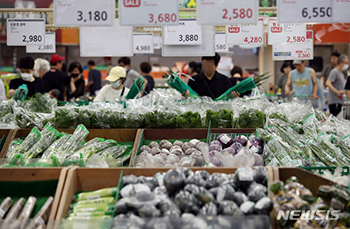 【NEWSIS】集中豪雨や猛暑でサニーレタスなど葉物野菜の卸売価格が上昇し、体感物価にも影響を及ぼしている。写真は23日、ソウル市内のある大型スーパーで、葉物野菜を選ぶ買い物客たち。