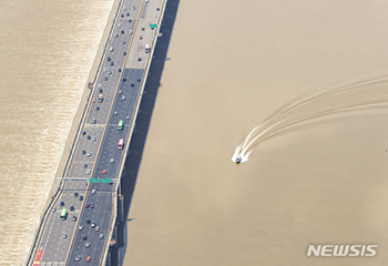 梅雨が小康状態となった19日午後、ソウル市松坡区のロッテワールドタワー「ソウル・スカイ」から見た漢江は泥水に変わっていた。