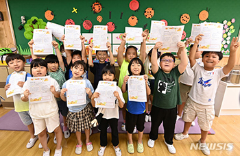 夏休みが始まった19日、京畿道水原市八達区の南昌小学校にて、明るい表情で夏休みのプリントを持って見せる2年1組の児童の様子。