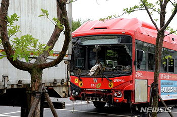 【NEWSIS】忠清北道清州市内の宮坪第2地下道で冠水したバスが18日午前、清州市内のレッカー車両保管所へ移動された。