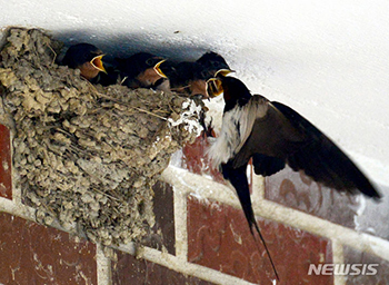 雨が降っている18日午前、慶尚南道南海郡南海邑の住宅の軒に巣をつくったツバメが、すっかり大きくなったヒナたちに一生懸命にえさを運んで食べさせていた。