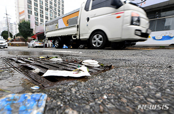 18日午前、光州市北区三角洞の商店前の道路では、雨水ますの周りにごみが落ちていた。