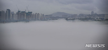 雨天が続く13日、ソウル市竜山区の漢江大橋から見た漢江は川霧に覆われていた。