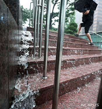 梅雨が続く13日午後、ソウル市中区の乙支路1街交差点付近で、雨傘を差して道を急ぐ市民の様子。