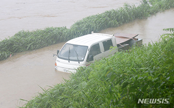 【NEWSIS】全羅北道のほとんどの地域で大雨警報が発令された14日、全羅北道全州市完山区の三川近くで、浸水した車。