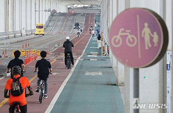 6日午後、ソウルの潜水橋を通る市民や車両の様子。ソウル市は、盤浦大橋の下段に架かる潜水橋を歩行専用橋梁に転換すると同時に、市民の余暇文化空間として造成する企画デザイン公募を実施する。