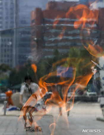 暑さが続く3日、オリンピック公園(ソウル市松坡区)の「平和の門」に設置された聖火越しに、ソウル都心の風景が揺らいで見える。