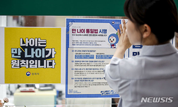 【NEWSIS】これまで韓国で一般的だった数え年をやめ、満年齢で統一する「満年齢統一法」が施行された28日午前、ソウル市松坡区庁の市民相談室で、法施行に関する案内文を掲示する区職員。