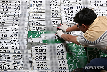 上半期の京畿道滞納車両一斉取り締まりの日となった28日、京畿道水原市の勧善区庁で、税務課徴収チームの職員らが滞納車両から領置したナンバープレートを整理している様子。対象は、自動車税を3回以上または自動..