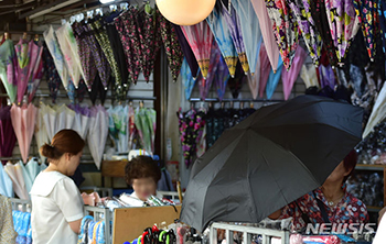梅雨のシーズン真っ最中の28日午後、大邱市中区の西門市場にある雨傘の店で、傘を選んでいる市民の様子。