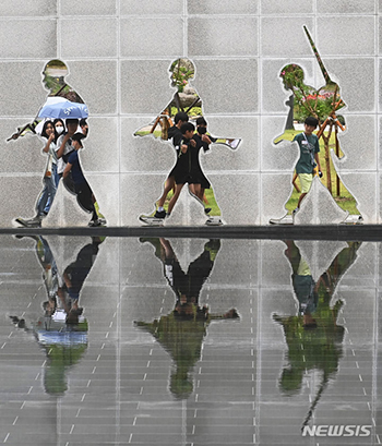 6・25戦争73周年まであと四日と迫った21日、京畿道烏山市の竹美嶺平和公園で、現場学習にやって来た子どもたちが国連軍スミス支隊の行軍の様子をかたどった造形物の前を歩いている様子。