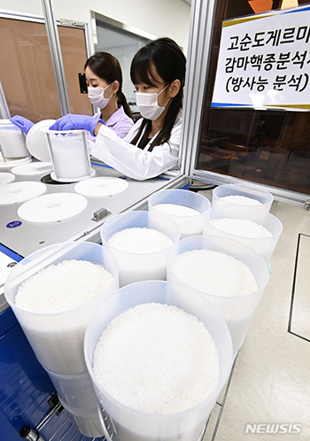 京畿道水原市勧善区の京畿道保健環境研究院で21日、研究員らが天日塩を対象に放射能安全性検査を行っている様子。この日、同院は「大手小売店やオンラインマーケットなどで販売している韓国国内産の天日塩を対象に..