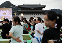 【NEWSIS】「国際ヨガの日」の21日、ソウル・光化門広場の「六曹マダン」で、「光化門月光ヨガ」開幕式が行われた。写真はヨガを習う参加者たち。