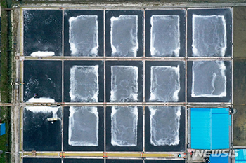 全羅南道の多くの地域で雨が予想される中、全羅南道新安郡の塩田では20日午前、塩の収穫の真っ最中だった。