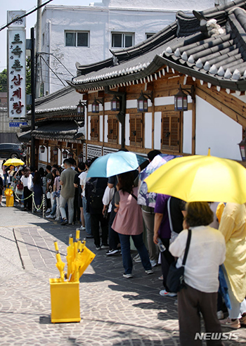 【NEWSIS】ソウル全域に今年初の猛暑注意報が出された18日、ソウル市鍾路区のサムゲタン(参鶏湯)専門店を訪れ、日傘をさして行列する人々。サムゲタンは若鶏のおなかに高麗ニンジンなど体にいい食材を詰..