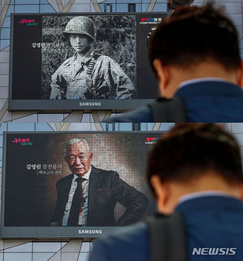 【NEWSIS】19日、ソウル市中区のソウル市庁外壁電光掲示板に、18歳で6・25(朝鮮戦争)の「白馬高地の戦い」に参戦したキム・ヨンリン参戦勇士の過去と現在の写真が映し出された。ソウル市は「『70..