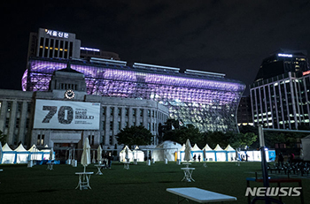 【NEWSIS】世界的な人気を誇る韓国の人気男性アイドルグループBTS(防弾少年団)がデビュー10周年を迎える前日の12日、ソウル市中区のソウル市庁庁舎がBTSのシンボルカラーである紫色にライトアッ..