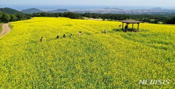 きれいな晴天となった25日午前、済州市吾羅洞の中山間地域に広がる野原では、春の花である菜の花が大きく花開き、視線を引き付けていた。
