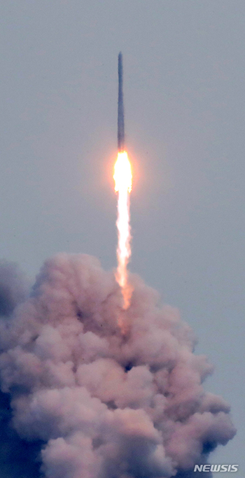 25日、全羅南道麗水市の狼島から眺めた高興郡の羅老宇宙センターの発射台から、韓国の国産宇宙ロケット「ヌリ号」(KSLV-2)が打ち上げられ、宇宙に向けて飛び立っている。 通信問題で24日に予定されて..