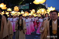 釈迦生誕日(旧暦4月8日。今年は5月27日)まであと一週間となった20日、ソウルの鍾路一帯で、仏教徒がランタンを持って行進をしている様子。