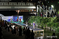 20日、ソウルの清渓川・五間水橋の「水辺ステージ」で開かれた清渓川水上ファッションショーで、モデルがランウェイ上を歩いている。