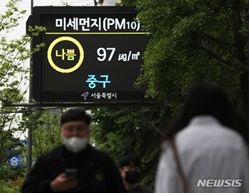 中国から飛来した黄砂の影響でPM2.5などの微小粒子状物質の濃度レベルが「不良」となった22日午前、ソウル市内のPM2.5電光掲示板に現況が表示されている。