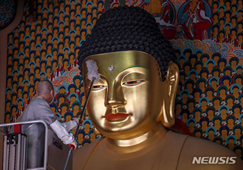 釈迦生誕日が間近に迫った16日午後、ソウル市鍾路区の曹渓寺大雄殿で、僧侶が三尊仏のほこりを払う「掃除灌浴」の儀式を行っている。
