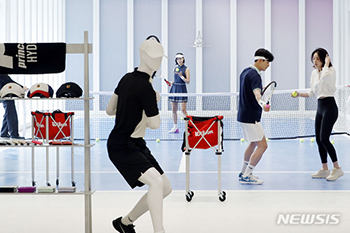 ロッテデパートが12日、ソウル市蚕室のロッテワールドモール3階にて体験型テニス売場「テニスメトロ」をPRしている様子。ロッテデパートはテニスメトロと提携し、さまざまなテニス用品およびウエアをそろえると..