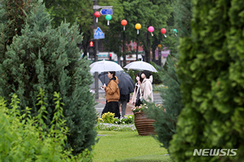 【NEWSIS】二十四節気で夏の兆しが見え始めるころとされる「立夏」の6日午前、ソウル市中区のソウル広場で、傘を差して雨の中を歩く人々。