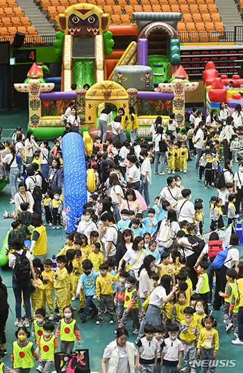 京畿道水原市長安区の水原室内体育館で3日、水原市オリニチプ連合会主催の「集まれ友だち、外で遊ぼう」イベントが開かれ、子どもたちが遊具に乗って楽しいひとときを過ごしている。