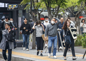 ソウルで朝の気温が前日に比べ10度ほど下がった20日午前、ソウル市鍾路区の世宗路交差点では、バスを降りた市民たちが上着を羽織っていた。