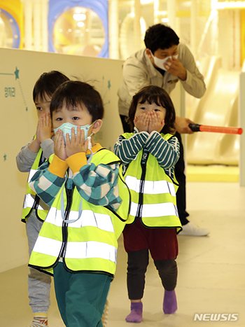 ソウル市江南区の「逸院子ども室内遊び場」で18日、オリニチプ(民間保育施設)の園児たちが火事に備えた避難訓練をしている様子。