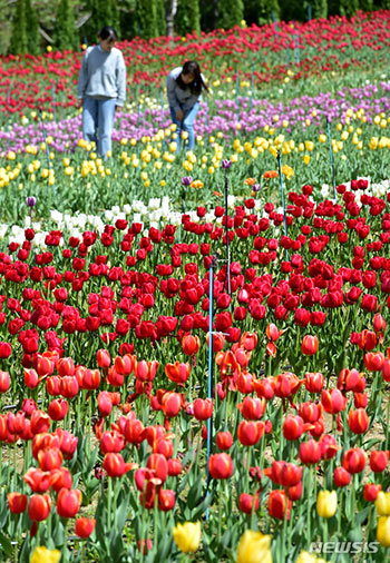 Eワールド(大邱市達西区)のチューリップ・ガーデンでは12日午後、訪れた人々が、大きく花開いたチューリップの道を巡りつつ春の気運を満喫していた。