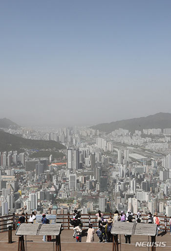 中国発の黄砂の影響により釜山市内の16の区・郡全てで「粒子状物質警報(PM10)」が発令された12日、遠足で荒嶺山ののろし台を訪れた子どもたちが白くかすんだ釜山都心を見降ろしている様子。