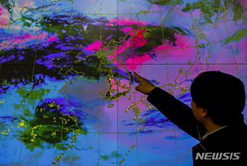 中国発の黄砂の影響により韓国のほとんどの地域で粒子状物質の濃度が「極めて悪い」の水準を示した13日、韓国気象庁(ソウル市銅雀区)の電光板に表示された衛星画像に、韓半島を通過しつつある黄砂(赤い部分)が..