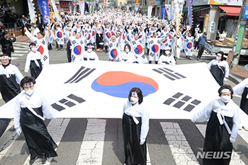 「104周年 蔚山兵営三・一万歳運動 太極の波街頭行進および再現行事」が6日午前、蔚山市中区の兵営小学校-兵営交差点一帯で行われ、参加者らが大韓独立万歳を叫びつつ街頭行進を行っている様子。