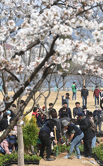 京畿道水原市八達区の西湖公園で29日午後、第78回植木日記念の植樹イベントが開かれ、市民が木を植えている様子。