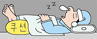 寝る時はあおむけになって、脚の下に枕やクッションを入れた方が良い。ひざを上げると脊椎(せきつい)が受ける負担が少なくなる。