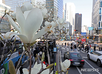 【NEWSIS】花冷えとなった27日午前、ソウル市中区の明洞聖堂交差点にはモクレンの花が咲いていた。