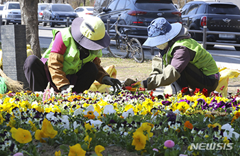 ソウル市広津区のトゥクソム漢江公園で14日、漢江事業本部の関係者らが春の花を植えている様子。漢江公園に植えられる春の花はパンジー、ビオラ、デイジーなど春を告げる花々7種類、10万6000本で、散策路周..