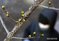 花冷えの一日となった2日午前、ソウル市中区を流れる清渓川のほとりでは、サンシュユのつぼみがふくらんでいた。