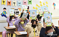 2023年度新学期が始まった2日午前、大邱市達西区のハンセム小学校で、配布を受けた教科書を持って見せている新入生の様子。